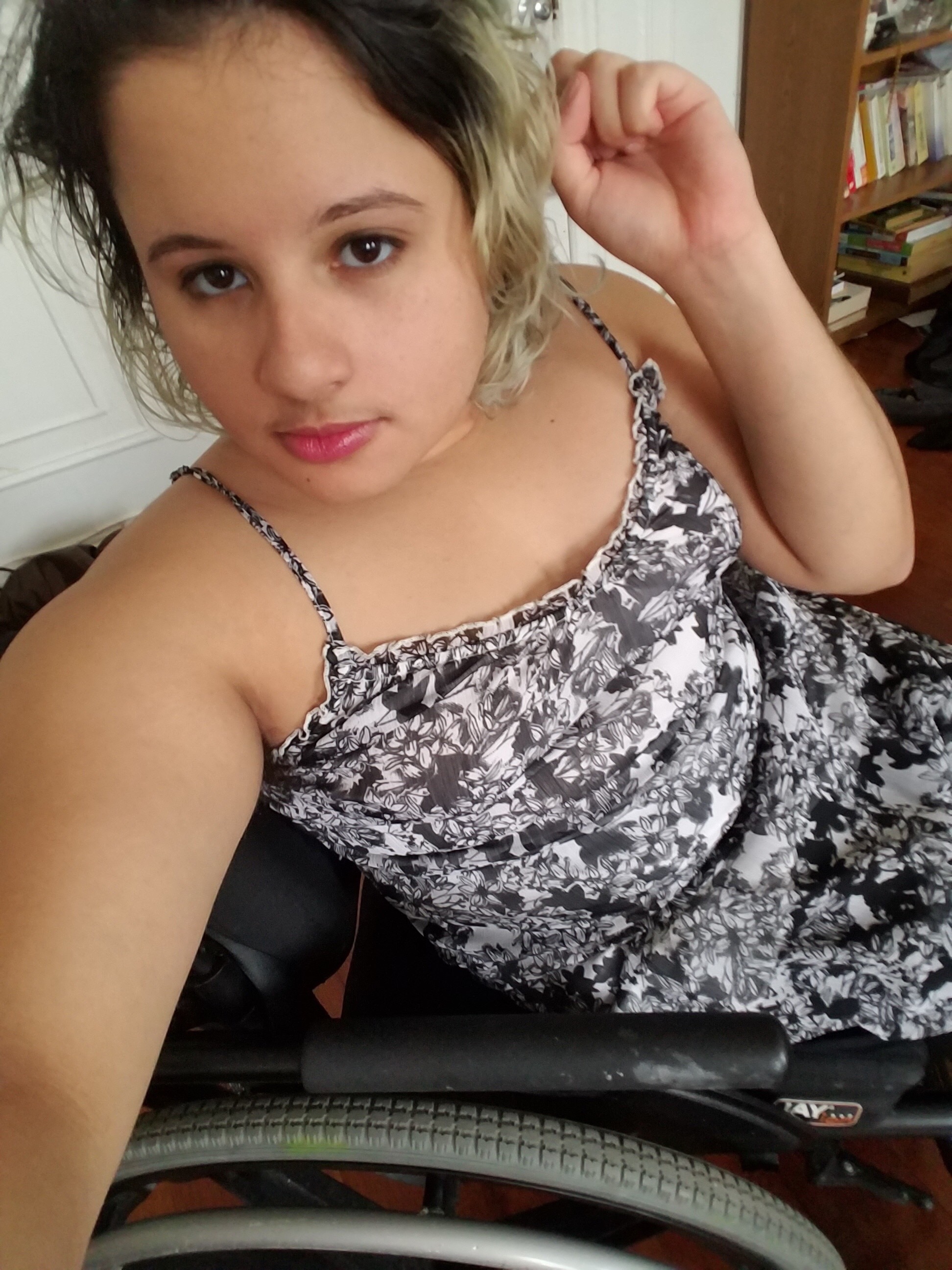 Photo: Female sitting in a wheelchair with short, wavy, two tone hair wearing a black and white dress with left fist up to ear level.