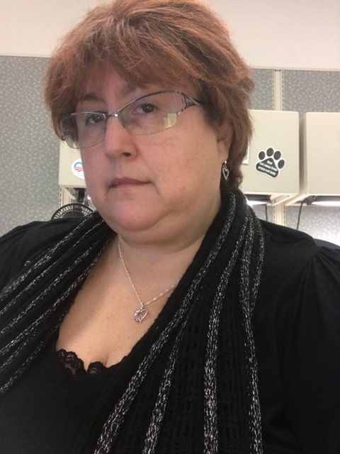 Photo: Image of a fat, light-skinned woman with red hair and thin-frame glasses. Wearing a black blouse and a black and silver scarf. Heart earrings & necklace. Grey-green & beige background with cat paw adornment.