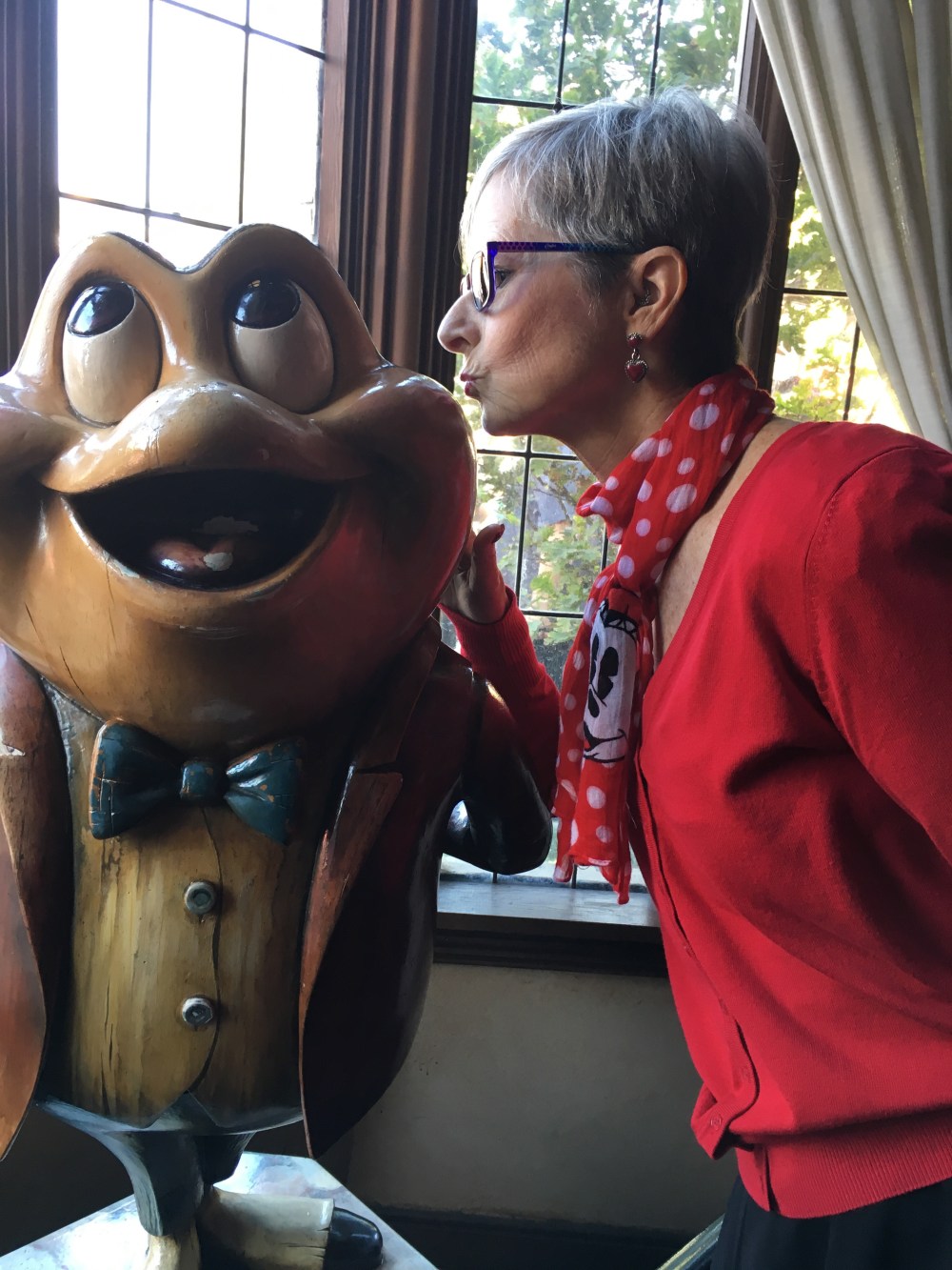 Description of photo: A gray-haired woman in a red cardigan and Mickey Mouse scarf kissing Mr. Toad at Disneyland.