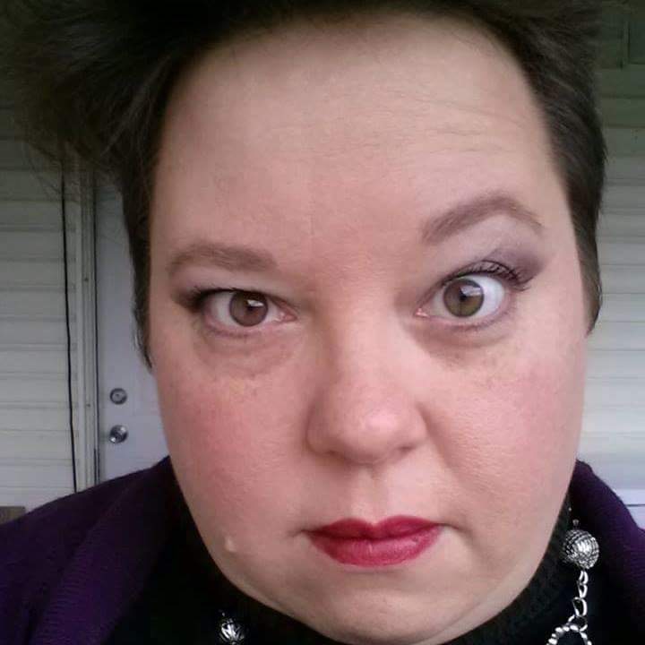 Photo description: a woman with short brown hair, awesome eye makeup, and red lipstick giving the “Mom eyes” look.