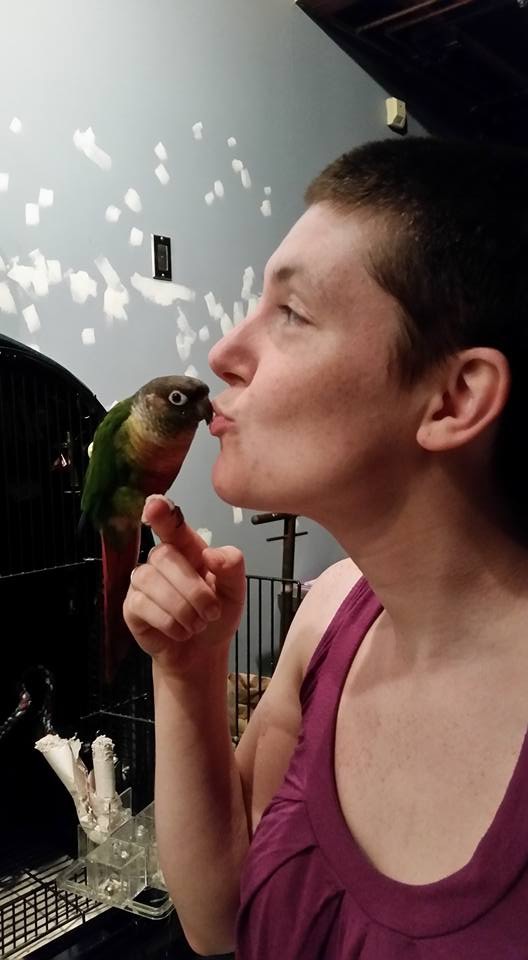 Picture caption – A feminine person with short brown hair in a pink tank top holds a small green parrot perched on her finger up to her puckered lips for a kiss. They are shown in profile.