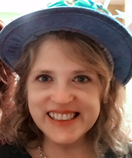 Photo: Woman smiling with blue hat, dark blonde wavy hair
