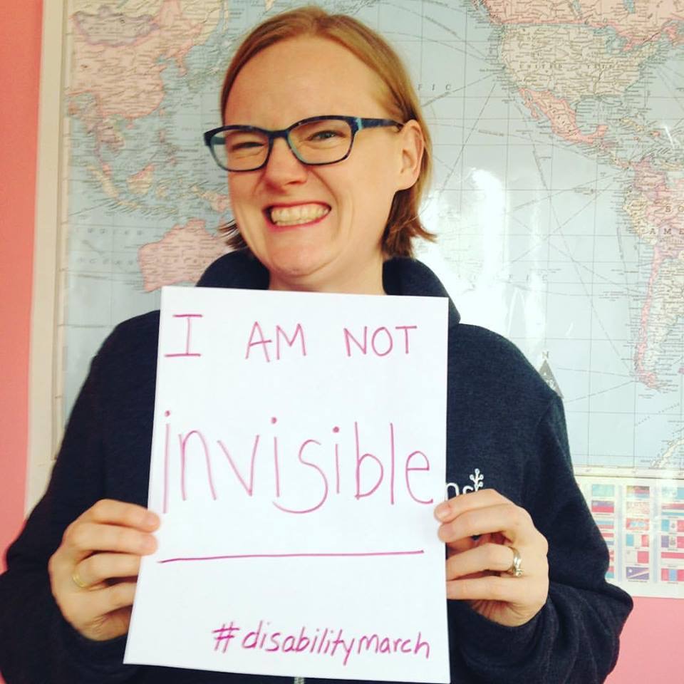 Visual description: a woman with glasses stands in front of a map on a pink wall. She is playfully sneering. She holds up a sign written in pink marker that reads “I am not invisible.” The hashtag “disability march” is written on the bottom.