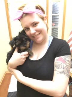 A girl in a black shirt and purple head bow holding a small dog